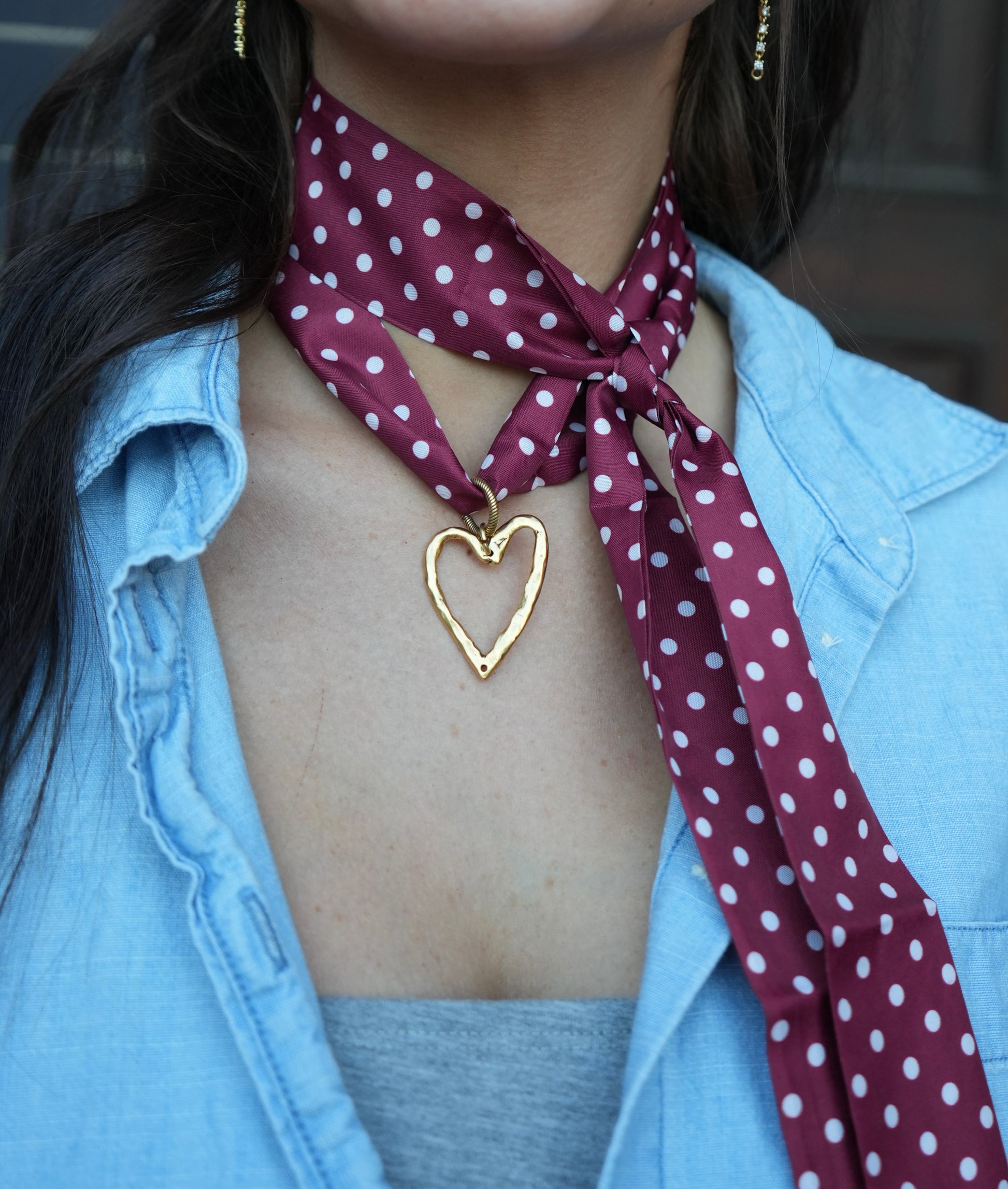 Our burgundy polka dot scarf features a dainty gold or silver heart charm. Tie it to your desired length for a customizable fit.